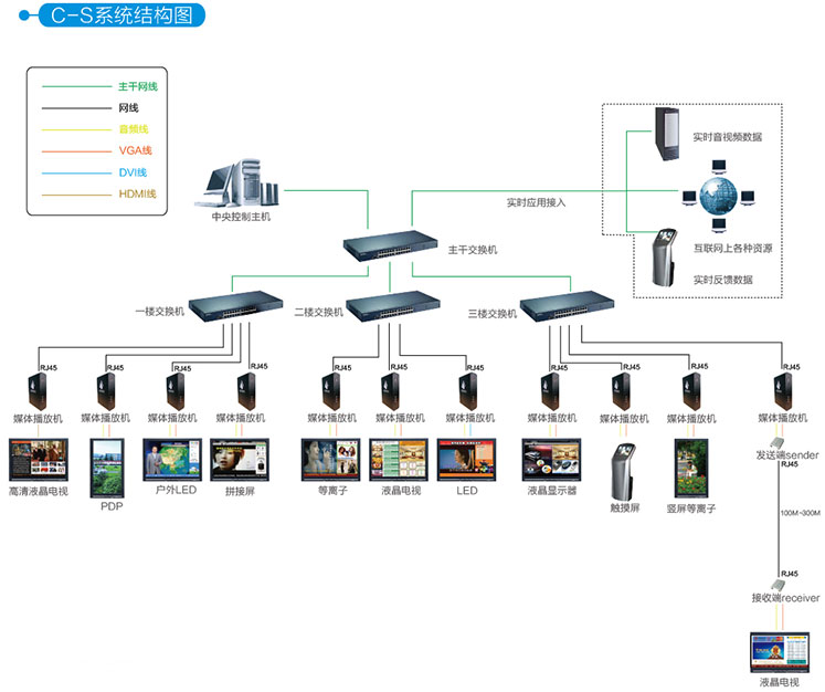 Wisedisplay—C/S是基于C/S(Client/Server)結(jié)構(gòu),即眾所周知的客戶端和服務(wù)端結(jié)構(gòu)。 Wisedisplay—C/S版本分別在客戶端和中央控制室端安裝系統(tǒng)軟件,實(shí)現(xiàn)一個管理員在一個中央控制室端統(tǒng)一控制管理所有的媒體顯示端,這樣可以更好的減輕客戶端的運(yùn)行負(fù)荷,同時數(shù)據(jù)的儲存管理功能更為透明。 系統(tǒng)結(jié)構(gòu)圖如下:
